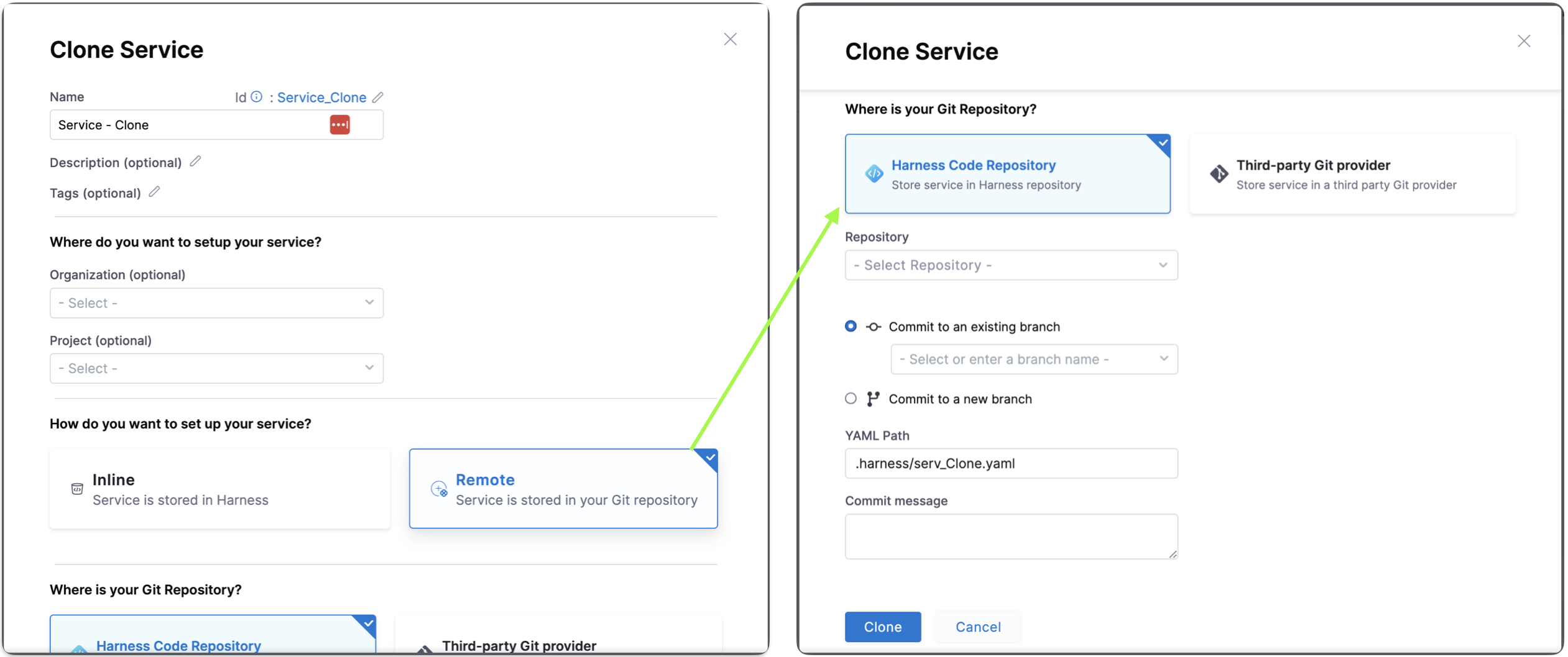 To Clone an inline service or remote service to a remote service, you must specify the target repository, Harness Code Repository, to store the service in the Harness repository or Third-party Git provider, to store the service in a third party Git provider, define the Git Connector if Third-party Git provider. Specify the Repository name, the YAML path, and the commit message.