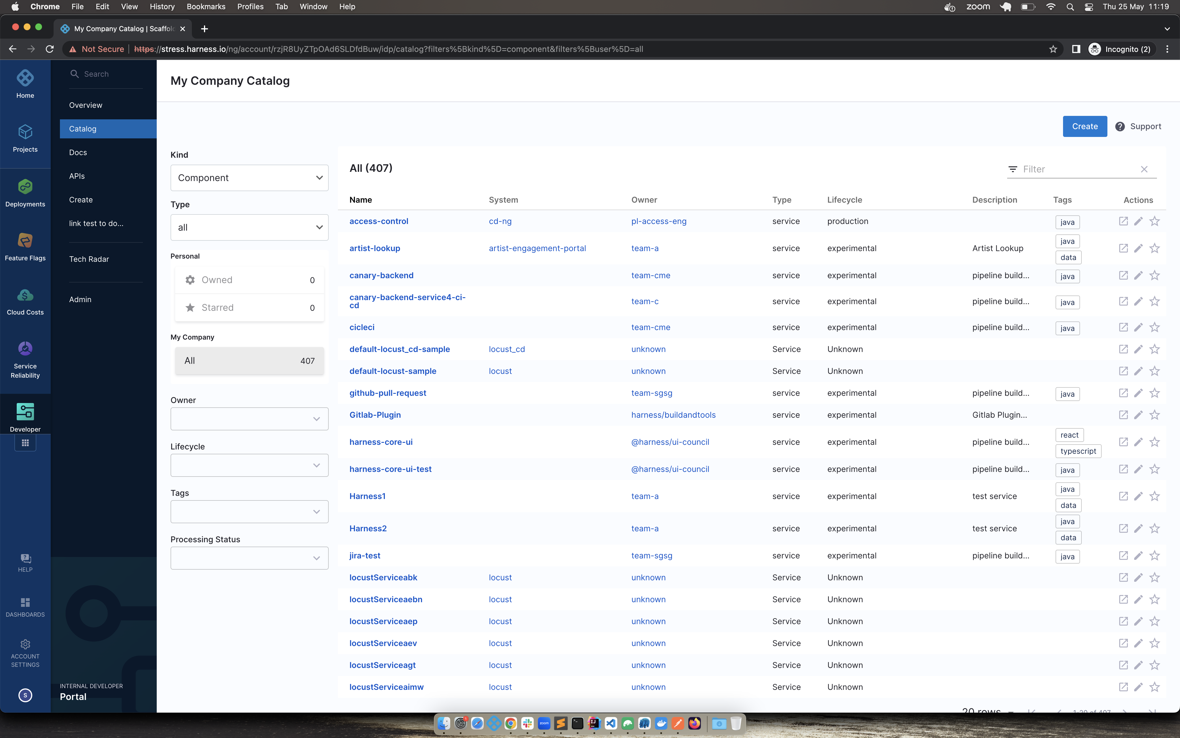 • User will be shown the list of services in their account. It will be defined in terms of IDP entity i.e Harness organization is a domain, Harness project is a system and Harness service is a component in the IDP world. This list includes services at all scopes.